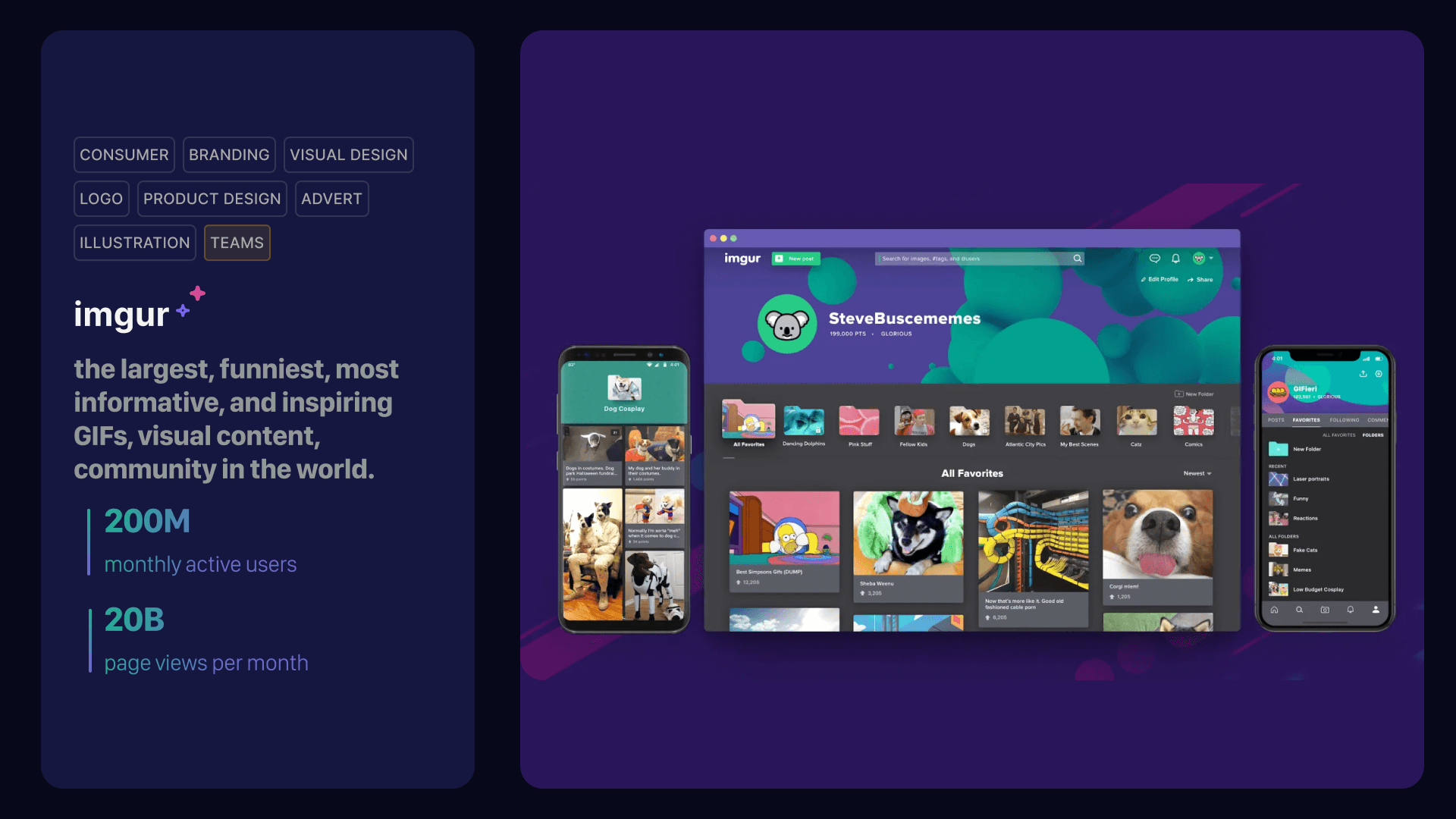 The rebrand resulted in a 26% increase in ad revenue and a 33% rise in signups, reflecting the success of our new direction. This project cemented Imgur’s role as a platform for discovery, memes, and content sharing, all while maintaining its community-driven nature. It also stands out as one of the most rewarding and challenging projects in my career, showcasing the tangible impact of strategic design decisions on both business outcomes and user engagement.