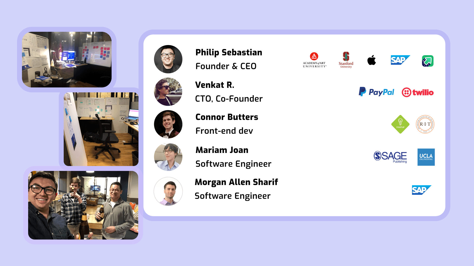 Venkat Ramanuja: CTO, Mariam Joan: Engineer, Connor Butter: Jr. Engineer
